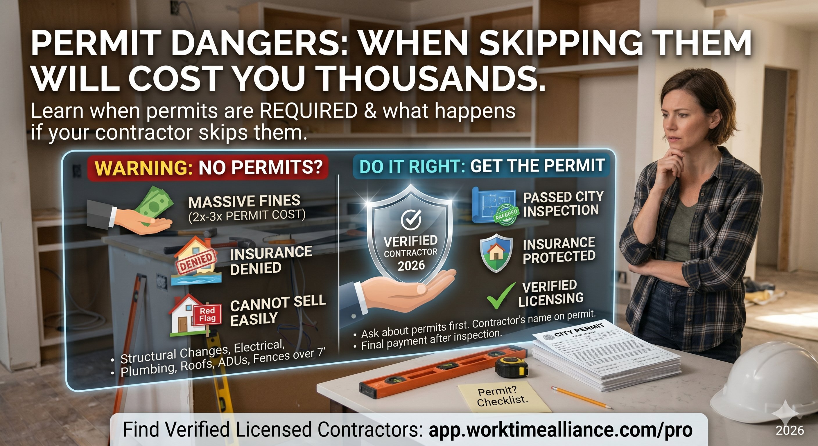 Need a contractor who handles permits properly? Find licensed professionals at app.worktimealliance.com/pro — every contractor on our platform is verified to be licensed and able to pull permits in their area.