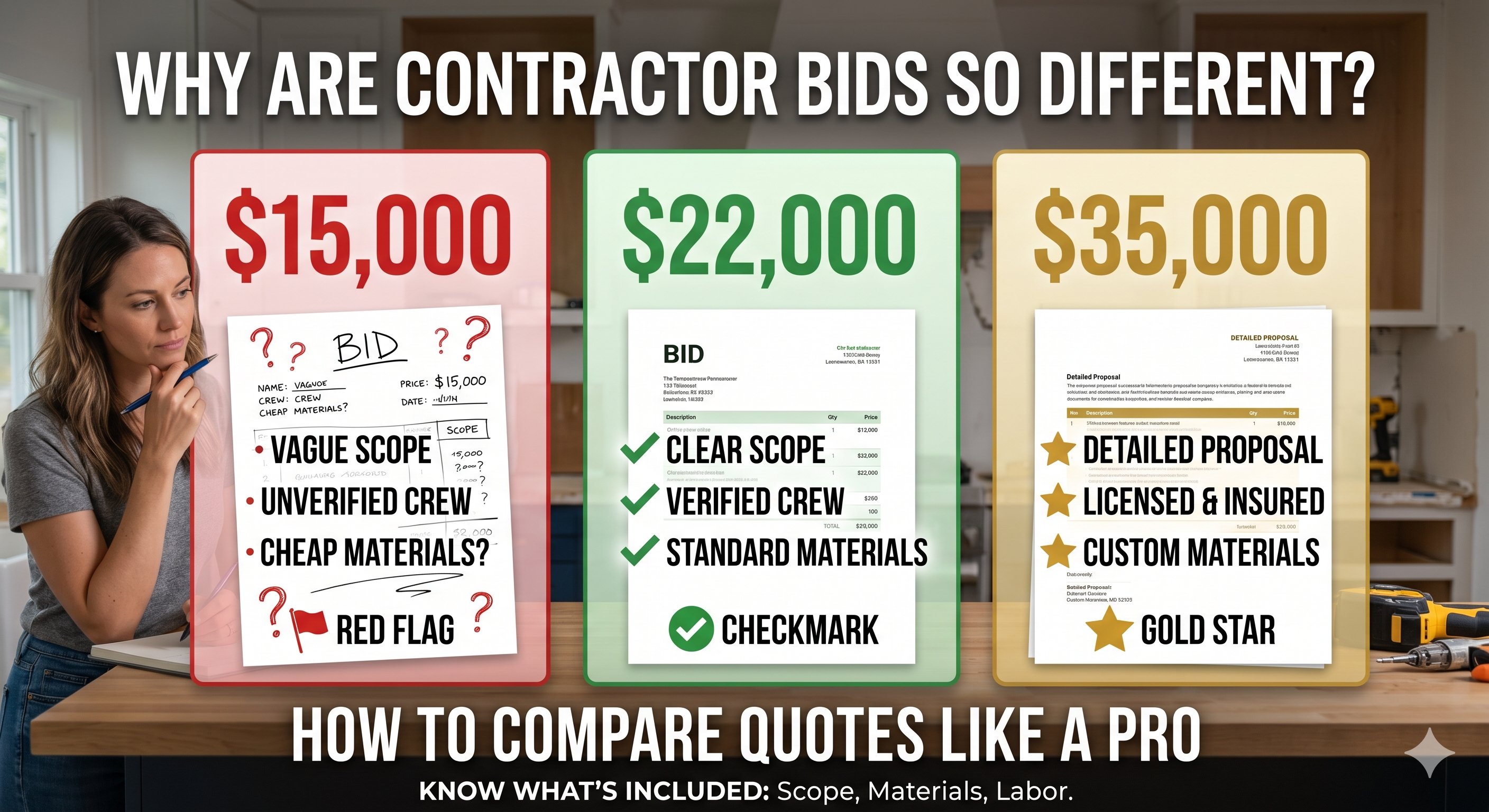 You posted your kitchen remodel and got three bids: $15,000, $22,000, and $35,000. Same project, wildly different prices. How do you know which one to trust?